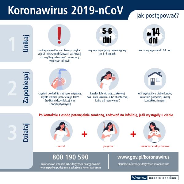 Wrocław zaczął od zalecania dokładnego mycia rąk, zasłaniania twarzy podczas kichania oraz zachowanie bezpiecznej odległości od osób kaszlących. Służby miejskie i sanitarne apelowały o przestrzeganie tych zasad, śledzenie komunikatów, zachowanie spokoju i nieuleganie panice.