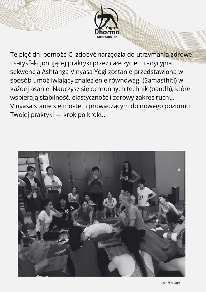 Te pięć dni pomoże Ci zdobyć narzędzia do utrzymania zdrowej i satysfakcjonującej praktyki przez całe życie. Tradycyjna sekwencja Ashtanga Vinyasa Yogi zostanie przedstawiona w sposób umożliwiający znalezienie równowagi (Samasthiti) w każdej asanie. Nauczysz się ochronnych technik (bandh), które wspierają stabilność, elastyczność i zdrowy zakres ruchu. Vinyasa stanie się mostem prowadzącym do nowego poziomu Twojej praktyki — krok po kroku. Nie ma rzeczy, których nie możesz osiągnąć, jeśli podchodzisz do tego z cierpliwością.
