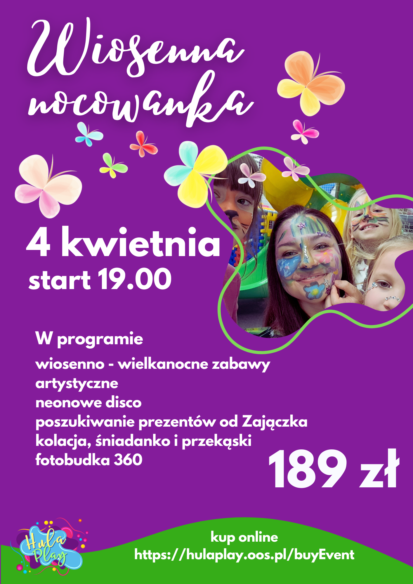 Wiosenna Nocowanka w Hula Play! Przed nami wyjątkowa noc pełna radości, zabawy i wiosennej magii! Już 4 kwietnia zapraszamy wszystkie dzieci w wieku 5–11 lat na Wiosenną Nocowankę w Hula Play.
