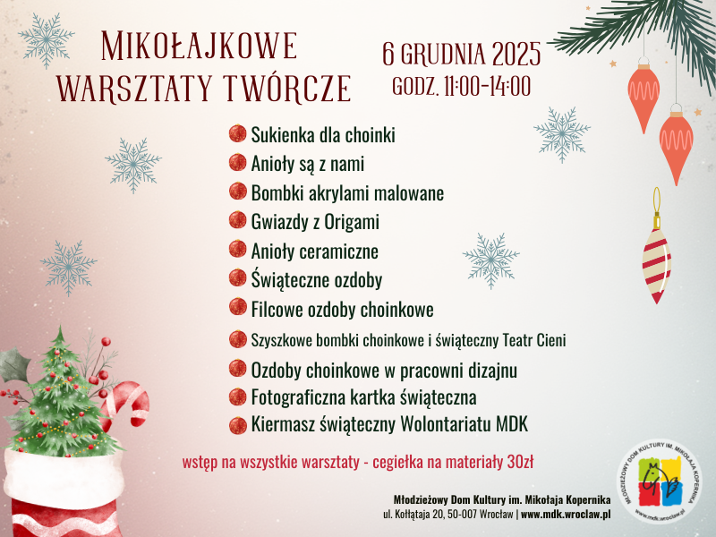 W Mikołajki, 6 grudnia, w godz. 11:00–14:00, w Młodzieżowym Domu Kultury im. Mikołaja Kopernika przy ul. Kołłątaja 20 odbędą się „Mikołajkowe warsztaty twórcze”.