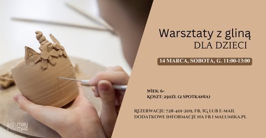 Zapraszamy naszych najmłodszych artystów na dwuczęściowe warsztaty lepienia z gliny, na których ubrudzenie sobie rąk, może oznaczać tylko dobrą zabawę pełną wyobraźni! 14 marca (sobota), godz. 11:00–13:00 – podczas pierwszego spotkania stworzysz proste formy ceramiczne: miski, kubki, talerze lub co przyniesie ci wyobraźnia!