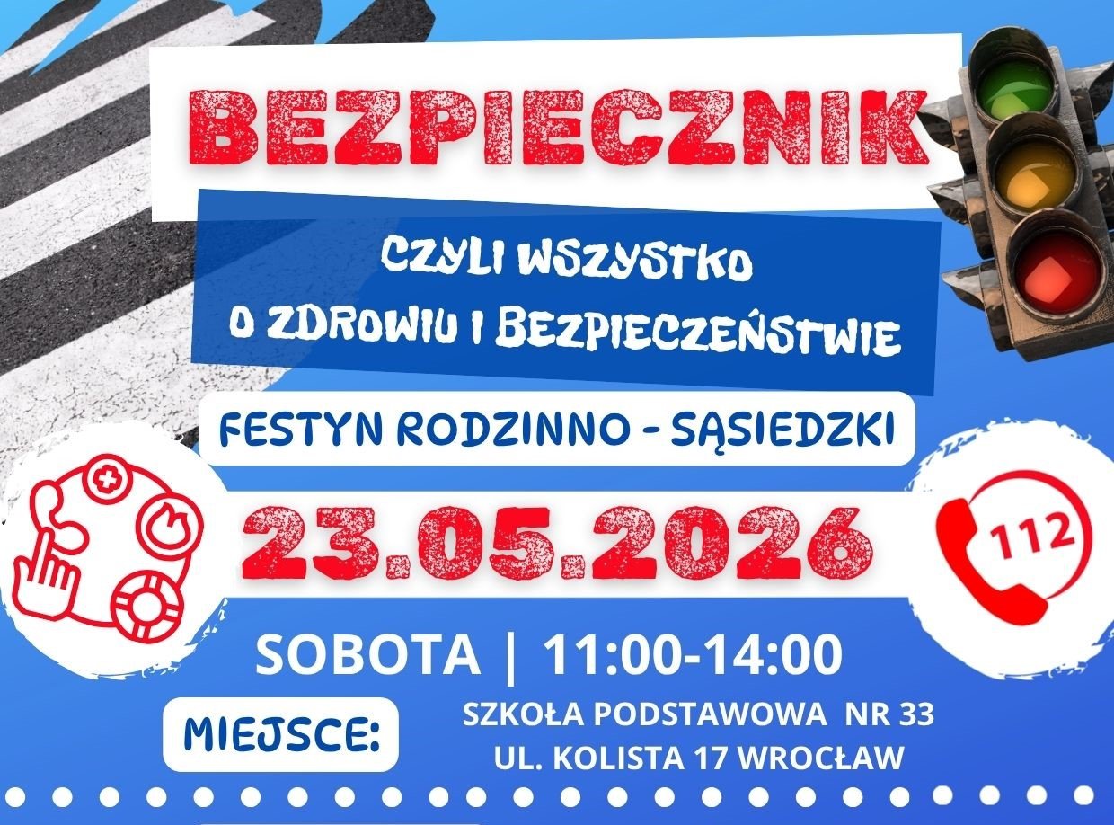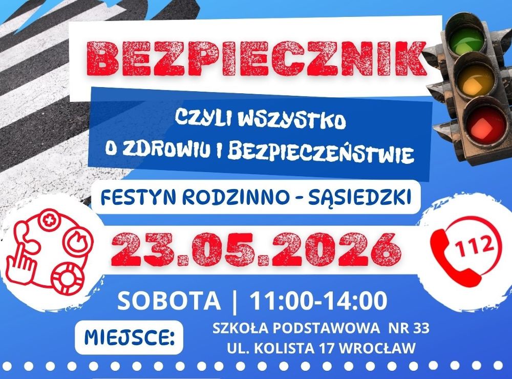 Rada Rodziców Szkoły Podstawowej nr 33 im. Tradycji Herbu Wrocławia zaprasza na III edycję rodzinnego festynu edukacyjnego „Bezpiecznik – wszystko o zdrowiu i bezpieczeństwie”.