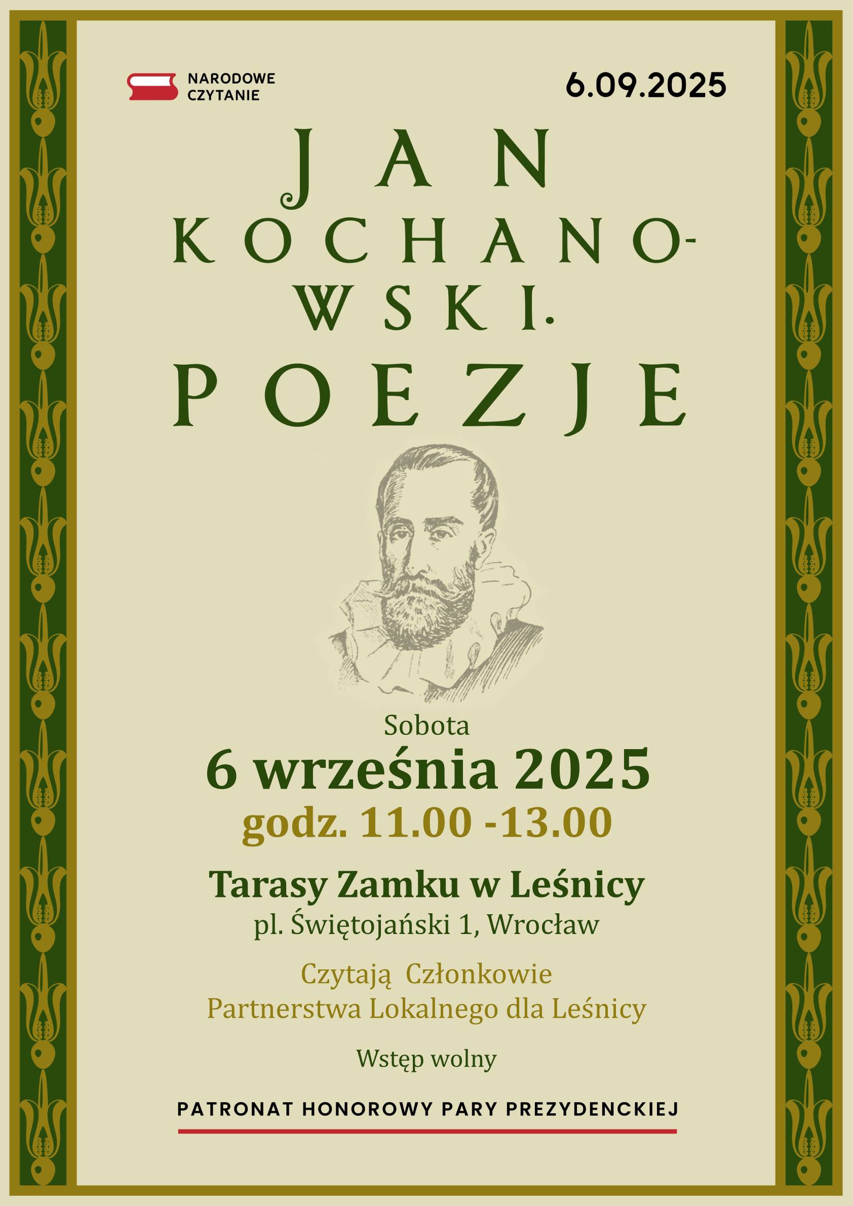 Prezydent Rzeczypospolitej Polskiej Karol Nawrocki wraz z Małżonką Martą Nawrocką zapraszają do udziału w Narodowym Czytaniu poezji Jana Kochanowskiego. Finał akcji odbędzie się 6 września 2025 roku.