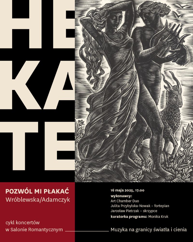 Zapraszamy na cykl koncertów towarzyszących wystawie „Hekate. Pozwól mi płakać – Wróblewska/Adamczyk”, które odbywają się w Salonie Romantycznym Muzeum Pana Tadeusza. Repertuar koncertów obejmuje utwory instrumentalne i wokalne, których nastrój lub temat związane są ze śmiercią, smutkiem i cierpieniem. Krystyna Wróblewska i Justyna Adamczyk podobne stany wyrażają w języku plastyki, którym się posługują. Zapraszamy w podróż przez żałobę, stratę, pamięć i nieuchronność, ale też przez piękno, które z tych doświadczeń wyrasta. Pierwszy koncert „Muzyka na granicy światła i cienia” odbędzie się 16 maja 2025. Wstęp bezpłatny, liczba miejsc ograniczona, wejściówki do odbioru w kasach muzeum.
