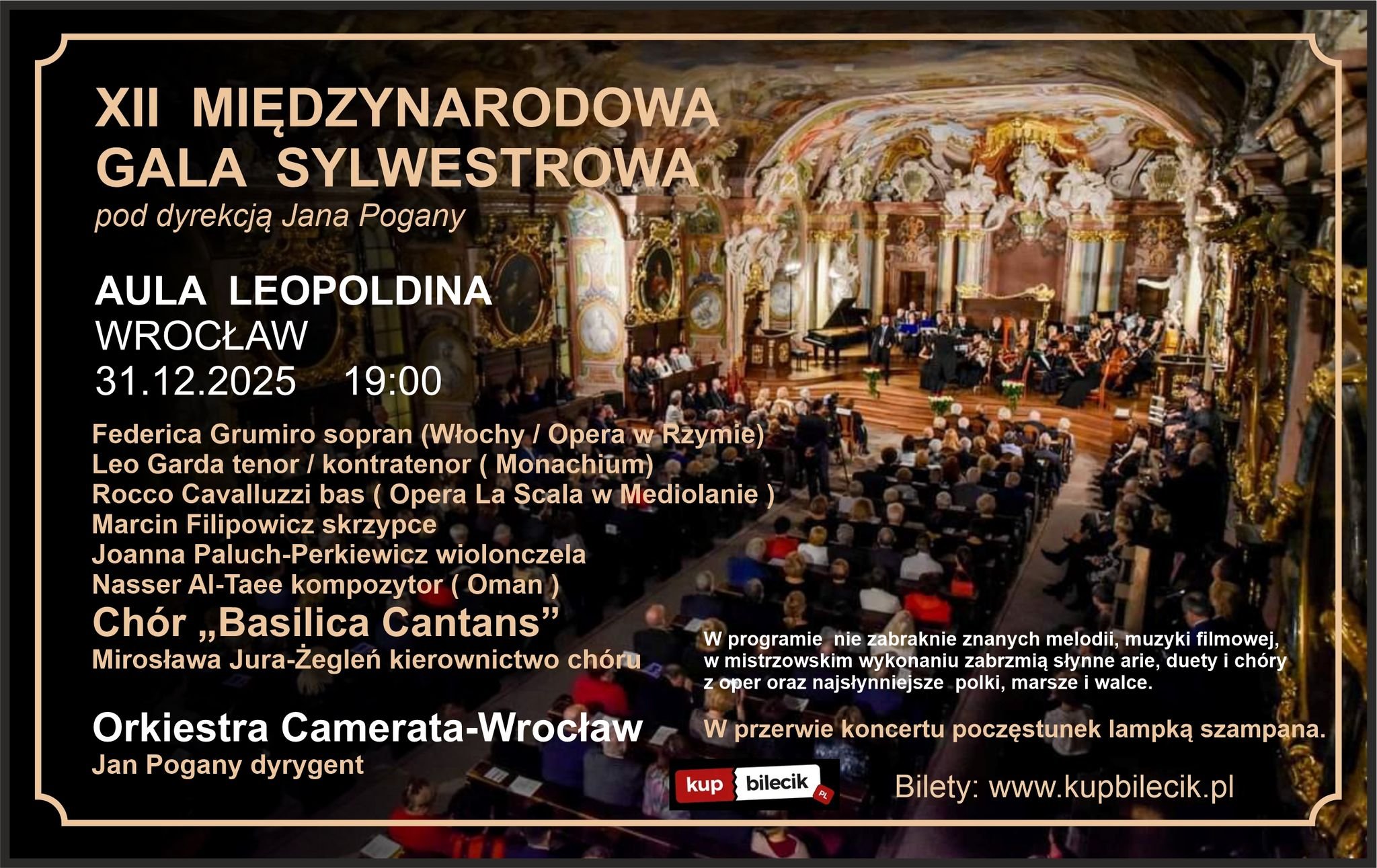 Zapraszamy na XII Międzynarodową Galę Sylwestrową, która odbędzie się w jednej z najpiękniejszych sal koncertowych Europy – barokowej Auli Leopoldina na Uniwersytecie Wrocławskim.