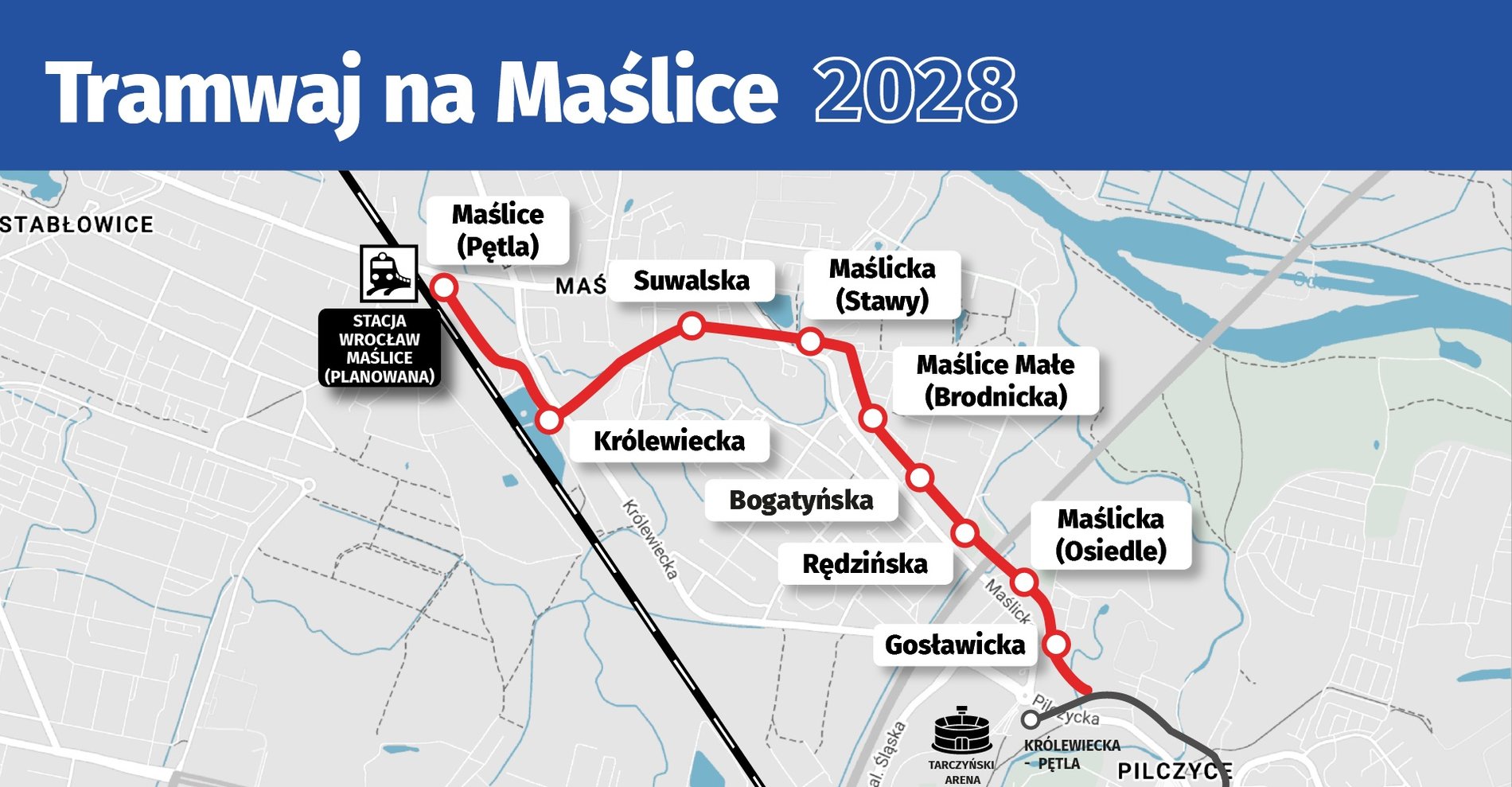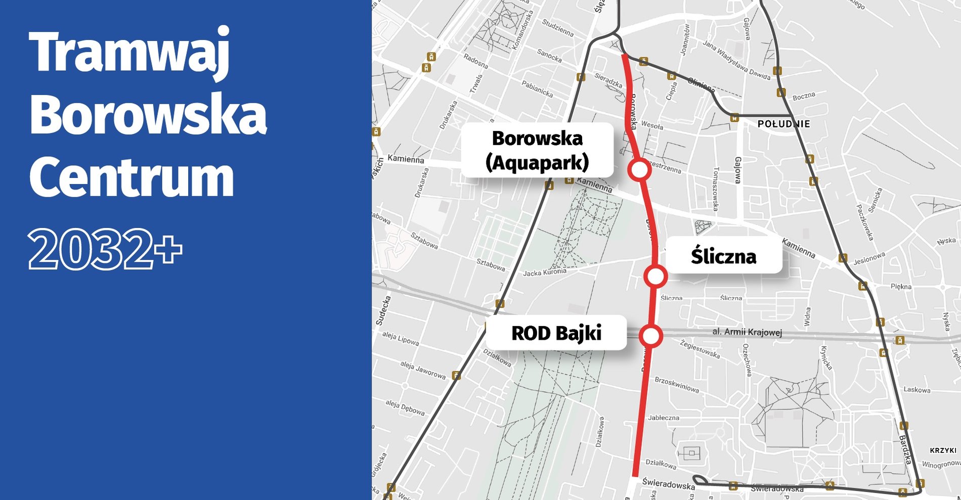 Nowa trasa tramwajowa liczyć będzie 3,2 km. Zacznie się od istniejącego torowiska na ul. Pilczyckiej, dalej poprowadzi wzdłuż Maślickiej, Królewieckiej, kończąc się pętlą pomiędzy galerią handlową przy Królewieckiej a linią kolejową nr 273. Tam ma powstać parking P+R.