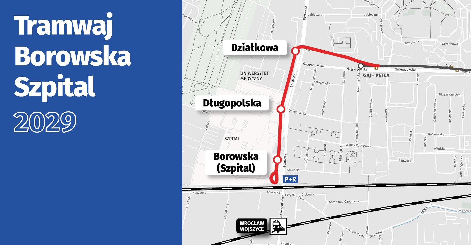 Powstająca linia tramwajowa będzie przedłużeniem torów, które obecnie kończą się na ul. Świeradowskiej (krańcówka Gaj). Poprowadzone zostaną do ul. Działkowej, a z niej skręcać będą w Borowską, gdzie powstanie trasa autobusowo-tramwajowa prowadząca do nasypu kolejowego. Przy nim będzie klasyczna pętla z parkingiem P+R.