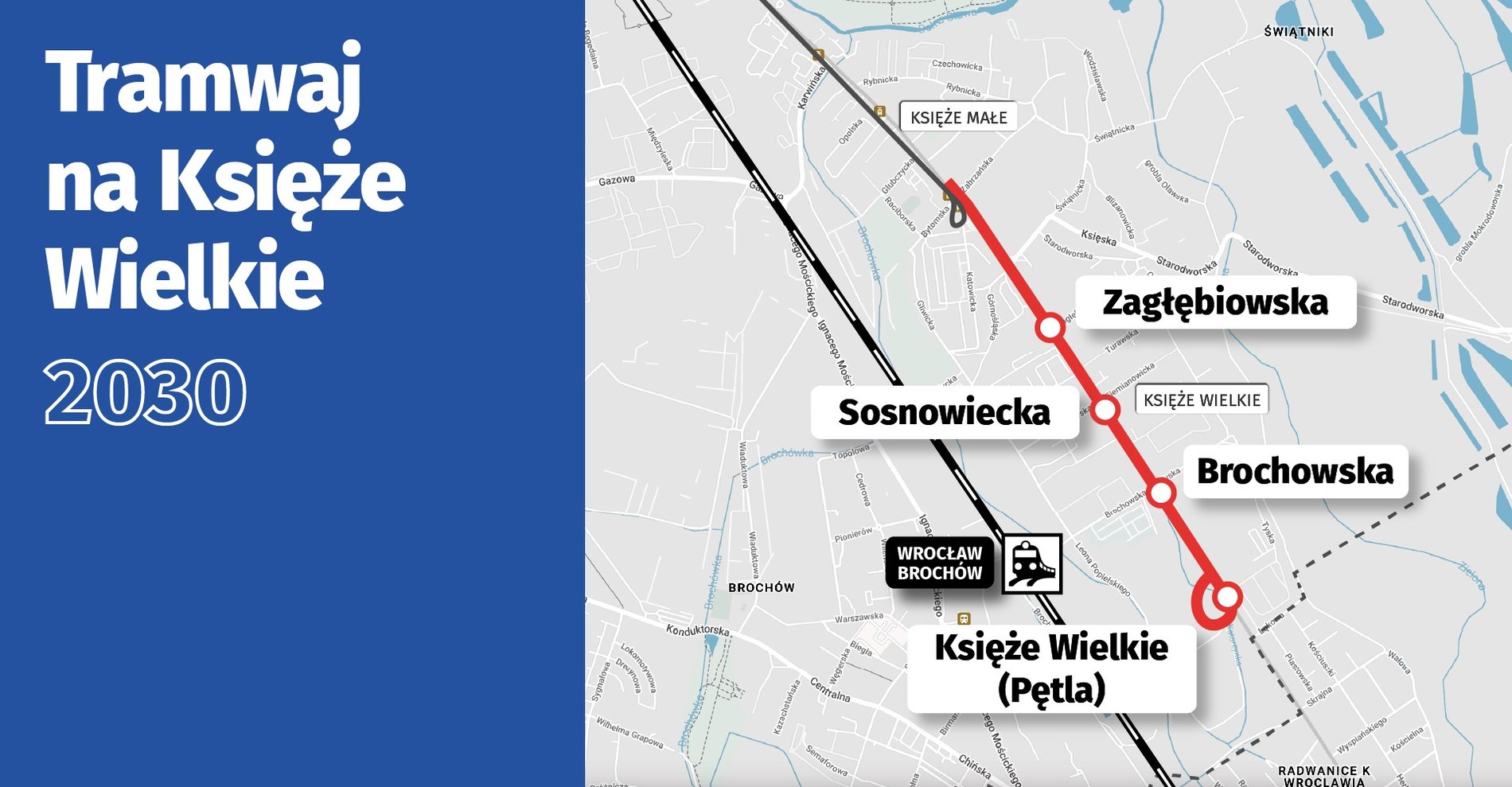 Połączenie tramwajowe związane jest z kompleksową przebudową ulicy Opolskiej, która stanie się "południową bramą miasta". Linia tramwajowa prowadzić ma od istniejącej pętli Księże Małe do nowej pętli w rejonie ul. Brochowskiej, gdzie powstanie również parking P+R. Zostanie również dobudowany drugi tor do pętli Księże Małe (obecnie prowadzi do niej tor pojedynczy).