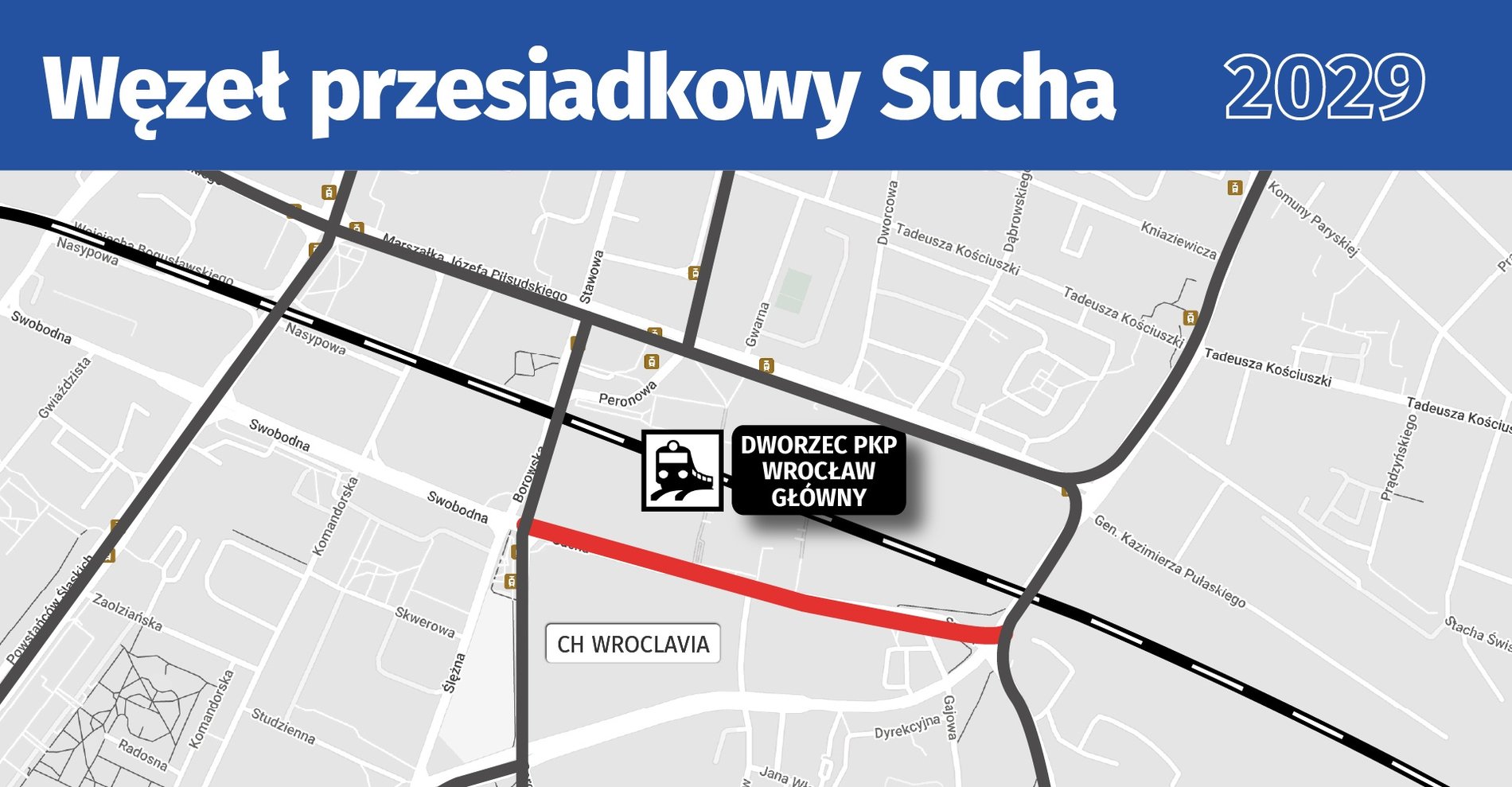Ulicą Suchą, pomiędzy dworcem PKP a Wroclavią (czyli również dworcem PKS), od Borowskiej do Dyrekcyjnej, biec będzie torowisko. Odciąży ono przeciążony odcinek na ul. Piłsudskiego oraz na ul. Stawowej. Pozwoli również na stworzenie zintegrowanego węzła przesiadkowego. Położony bezpośrednio pomiędzy dworcami PKP i PKS (obsługującymi ruch regionalny, krajowy i międzynarodowy) węzeł na Suchej stanie się węzłem przesiadkowym kolejowo-autokarowo-autobusowo-tramwajowym (i to jest wyjaśnienie określenia "multimodalny"). Zespół przystanków zlokalizowany będzie bezpośrednio przy wejściu do tunelu dworca PKP i wyjściu z galerii handlowej Wroclavia mieszczącej dworzec autobusowy.