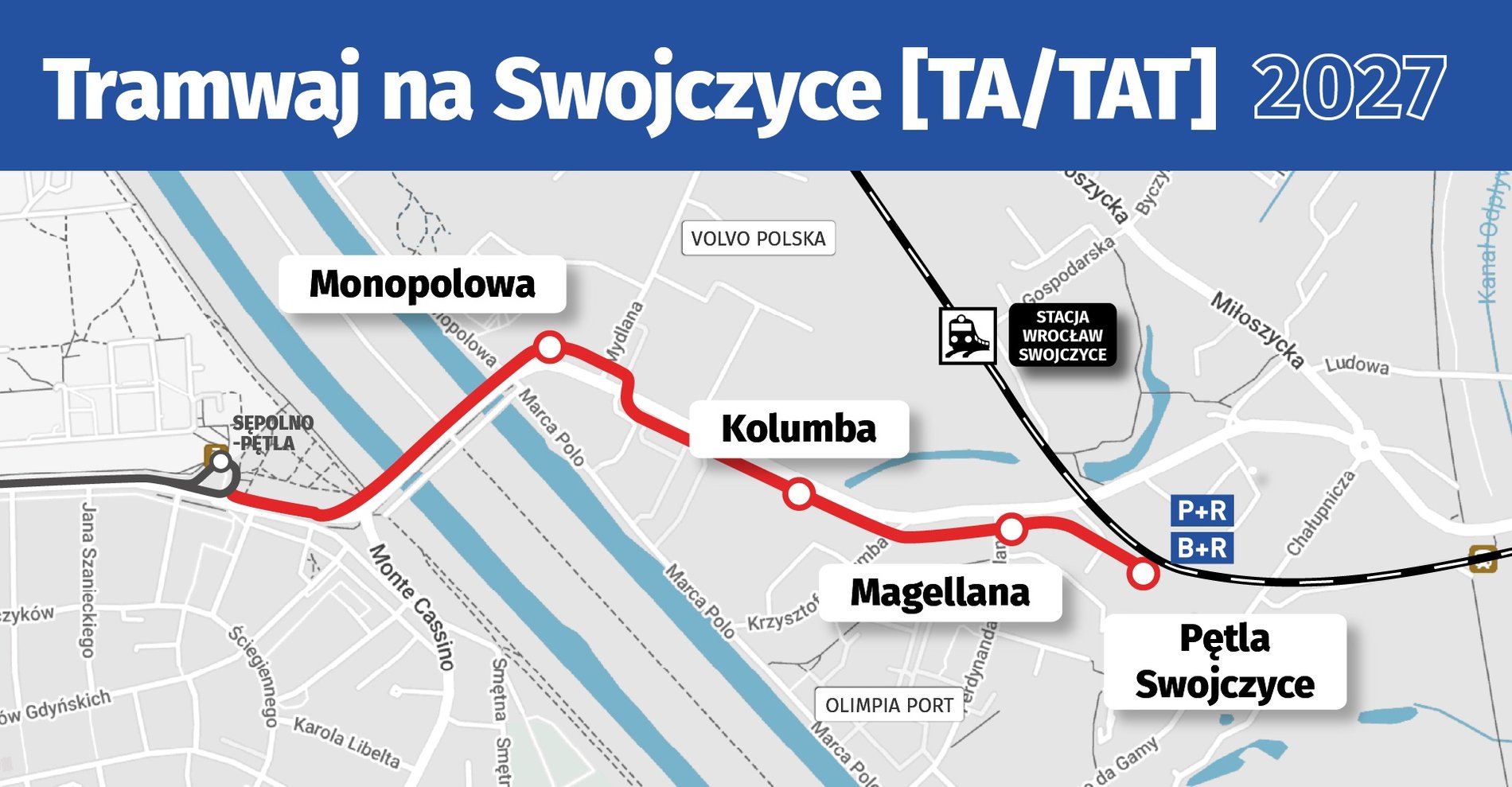 Linia tramwajowa będzie prowadzić od pętli Sępolno, przez ul. Mickiewicza, dalej nowymi mostami do ul. Swojczyckiej. Za ul. Magellana tory skręcą w prawo, aby zakończyć się pętlą w pobliżu ul. Chałupniczej - tam, gdzie jest ul. Cooka i cmentarz parafialny. Powstanie tam również parking dla rowerów i P+R.